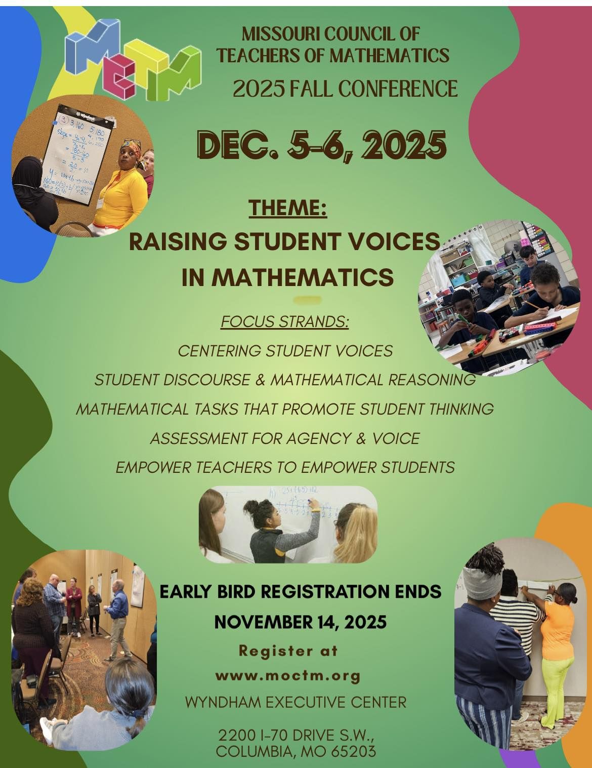 Cancellation policy: If your request for a refund is received in writing by 4:30 p.m. on November 5, MCTM will refund 50% of your registration fee. After November 5, no refunds will be issued, for any reason. No telephone requests for refunds will be honored. A district may send an alternate for a teacher who is unable to attend.
